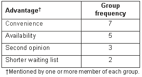 When asked to consider using a visiting specialist surgical service for a consultation, men and women differed in their responses. Although important to both, men rated knowledge of the visiting specialist's reputation and qualifications higher than women who were more concerned with the cost of accessing the service. The sample identified several advantages of visiting specialist services likely to increase utilisation (Table 3).