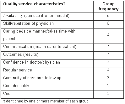 Participants were asked to indicate which aspects of a health service or hospital most influenced their decision to use it, accessibility, quality or distance/cost. All three were considered important with quality exerting the greatest influence. The characteristics of a quality service defined by the sample were similar for men and women (Table 4).