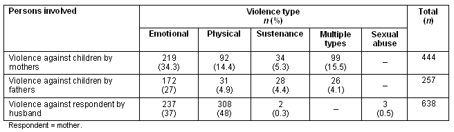 Sustenance abuse: Sustenance abuse was said to have taken place when the respondent or her husband or both stopped the daily food intake to the child; or if the respondent's husband stopped food intake for the respondent (his wife).