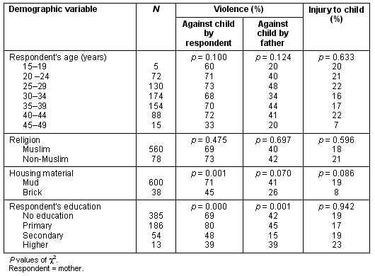The χ2 test was used to examine differences in proportions of violence against children and their injuries according to demographic variables. To assess the independent contribution of the independent variables in predicting exposure to violence against children and their injuries, logistic regression was run with all the independent variables included in the model. In the logistic regression, age per 5 year increase, respondent's income and husband's income per 100 Taka increase were considered continuous variables. The magnitude and direction of association were expressed through adjusted odds ratios. The contrast categories were denoted beside the concerned variables. Significant levels were expressed as p-values, with statistical significance assumed at p <0.05.