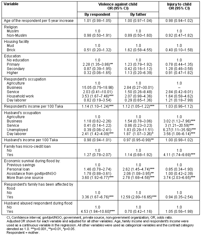 The logistic regression analysis demonstrated that parents' occupation is an important determinant of violence against children and their injuries during floods. Respondent's income per 100 Taka increase also elevated risk (OR 1.14; CI 1.10-1.24), but less than for occupation. Demographics such as a respondent's age, education, religion and housing material showed no significant relationship to violence against children and their injuries. Women engaged in household work abused their children three times more than women engaged in agriculture. Parental abuse of children was almost double in the families with daily earnings, compared with those with agricultural income. The means of economic survival were significantly related to violence and injury, which suggests flood-caused financial hardship in the family is an important determinant. Intimate partner violence was a significant risk factor for mother to child violence from during floods (Table 3). Children whose fathers were unemployed were five to six times more likely to be injured during floods.