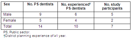The purposive sample for this study consisted of the 14 public sector dentists in Lesotho at the time of the study. Ten dentists met the criteria for participation (≥1 year of district oral health planning experience and a willingness to share their experiences); however, three of these were inaccessible at the time that time of the study (Table 1).