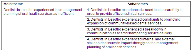 The main theme, that Lesotho dentists found the management planning of oral health services inefficient, summarizes the issues in the sub-themes. Some specific participant experiences characterized the inefficiency, such as careful planning being hampered by a limitation to information required for decision-making: