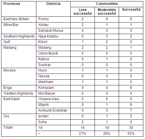 Lack of community cohesiveness and a gender dominant hierarchy was evident in 'unsuccessful' communities. Community discussions and observations suggested if community leadership was weak then individuals showed little respect for it, and there was little mutual cooperation. This was demonstrated by their lack of support for weekly community activities. In communities where politics and jealousy had affected the leadership there was little sustainable evidence of lasting change influencing health and wellbeing. Also, in communities where national level staff, as distinct from local district personnel, had conducted training, community members failed to claim 'ownership' of changes.