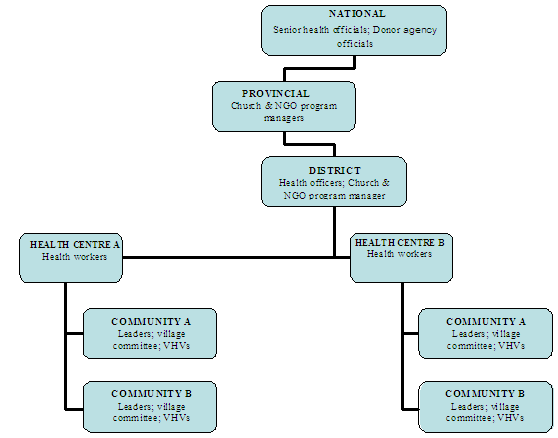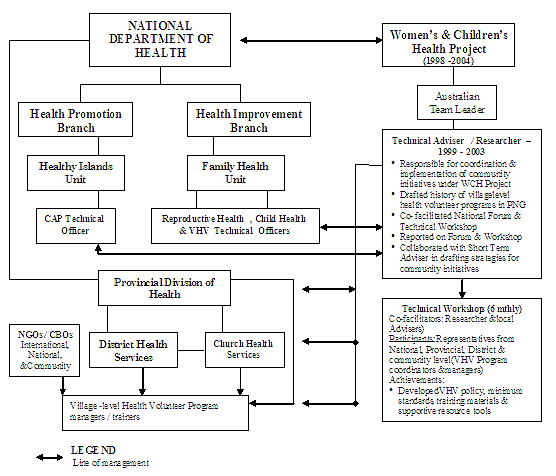 Figure 1: Titles, roles, and relationships of individuals engaged in the Women and Children's Health project community interventions between 1999 and 2003.