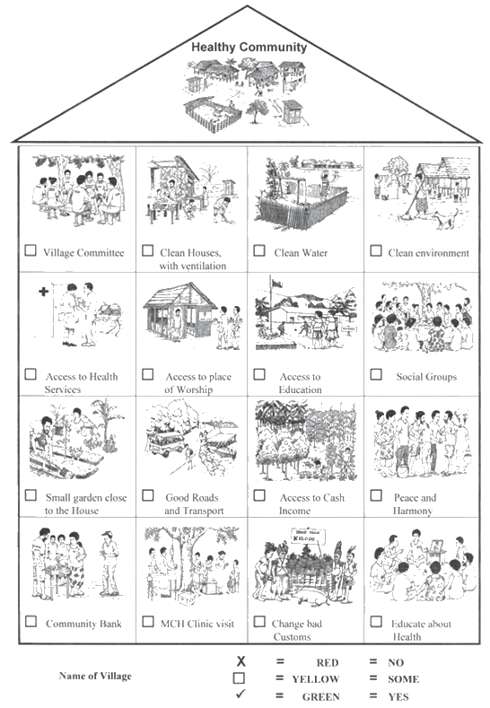 Key indicators of a healthy lifestyle were incorporated into two visual tools for monitoring community and family progress (eg 'healthy community' and 'healthy family'). The visual tool used 16 simple line drawings to depict each indicator (Fig2 is an example of one tool). These tools helped the community understand the link between the CAP process (community development principles) and VHV activities (educating about health) and the relationship to WHO's 'healthy village'9.