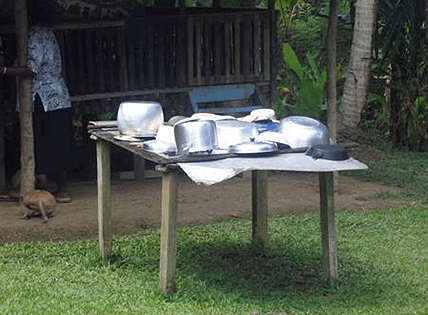 Examples of changed behaviours and hygiene practices included people using a pit latrine rather than defecating in the bush behind the house, in the garden or on the beach. Pigs have been removed from areas of human habitation and fenced in an enclosure. Some communities had relocated to allow each family space to build a new house with improved ventilation, a pit latrine and small vegetable garden. One community's resourcefulness provided water for household purposes by digging a drain and allowing nearby stream water to flow alongside the road through the village. Some families built raised platforms as a drying rack for cooking and eating utensils, protecting them from contamination by dirt, flies and animals (Fig6). 'Successful' communities often carved out an access road to the village, erected fences around each family's allotment and planted colourful shrubs along the fence line. This appeared to contribute to a sense of community pride, social cohesion and harmony.