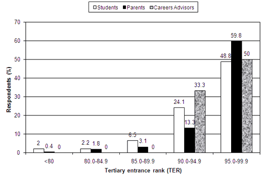 Careers advisors, students and parents were found to hold inaccurate perceptions of the minimum TER required to study medicine at the University of Adelaide; half of careers advisors, 48.8% of students and 59.8% of parents believed the required score to be 95 or greater (Fig1), whereas the actual requirement was a score of 90. Although there are currently no prerequisite subject requirements at the University of Adelaide, 425 students (92.2%) and 477 parents (93.2%) reported that at least one prerequisite subject was required to 'get into' (gain entrance to) medicine.