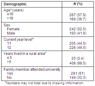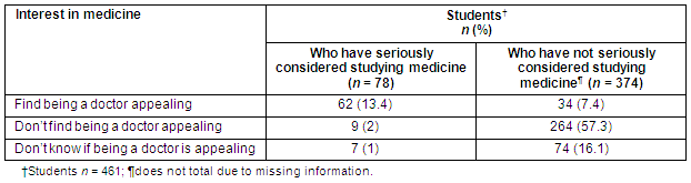 Of the 461 student respondents, 78 (16.9%) reported they had seriously considered studying medicine. Of these 78 students, 73 (93.6%) had sought information about university entrance; however, only 24 (30.8%) understood the purpose of the medical admission interview and 31 (39.7%) the purpose of the UMAT, and 44 (56.4%) believed they could get the TER required for medicine. Additionally, 61 (78.2%) were either unsure or thought that medical students were required to study in the city for the length of the course, being unaware of the opportunities provided by the national Rural Clinical School program. This and other data are provided (Table 2).