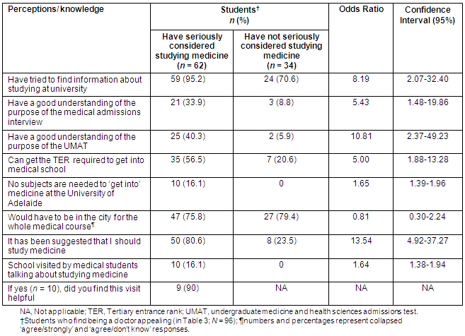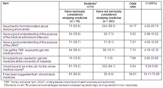 Not surprisingly there were a number of significant differences between students who had seriously considered studying medicine and those who had not. They were significantly more likely to understand the purpose of the medical admission interview and UMAT, believe they could achieve the required TER, know that no specific subjects were required to get into medicine at the University of Adelaide, and know medical students are not required to study in the city for the entirety of the course (Table 2).