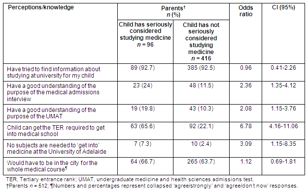 A comparison of parents whose child had seriously considered studying medicine and those whose child had not showed significant differences in perceptions and knowledge of medical course entry requirements and processes. Parents whose child had seriously considered studying medicine were significantly more likely to understand the purpose of the medical admission interview and UMAT, and to believe their child could obtain the required TER for medicine, and to be aware that no prerequisite subjects are required for entry to medicine at the University of Adelaide (Table 5). They also perceived the minimum TER required to study medicine at the University of Adelaide to be significantly lower than their counterparts (93.8 ± 5.1 vs 95.8 ± 4.2, p = 0.001).