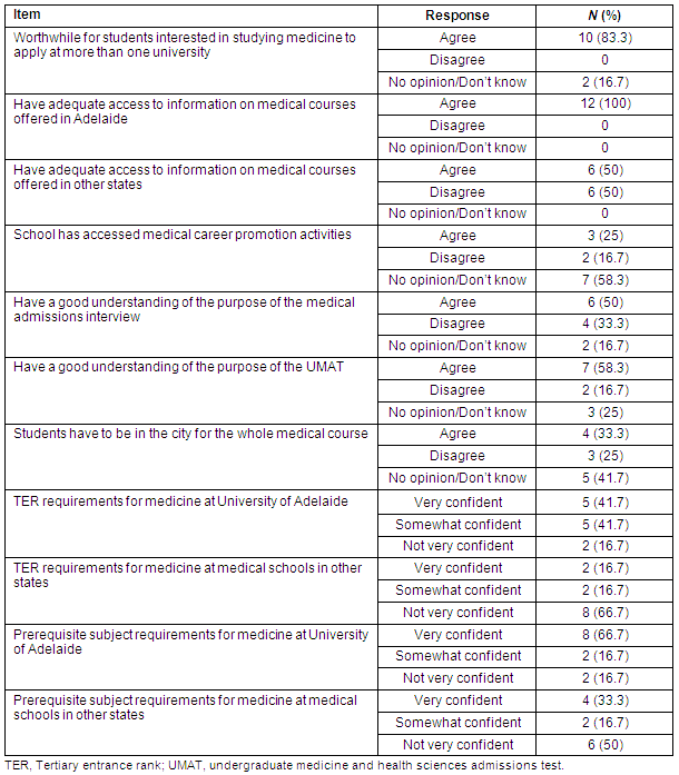Half of the careers advisors reported understanding the purpose of the medical admissions interview, and 58.3% reported understanding the purpose of the UMAT. While most were confident in their knowledge and access to information on medical courses in Adelaide, only 50% believed they had adequate access to information on interstate medical courses, which is reflected in fewer careers advisors being confident in their knowledge of interstate medical entry requirements. Only 25% of careers advisors stated their school had accessed medical career promotion activities, or knew that students are not required to study in the city for the length of the medical degree course. Career advisor responses to all questions are provided (Table 6).