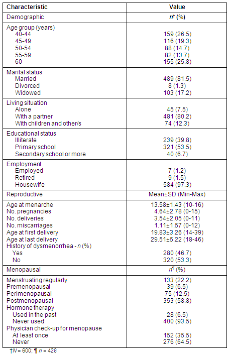 Table 1 presents the characteristics of the study group, the mean age of which was 52 years (SD=9.04). Of the 600 women, 347 (57.8%) were going through natural menopause, and 47 (7.8%) were menopausal due to surgical intervention.