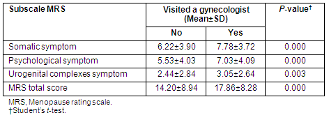 Table 3: Comparison of menopause rating scale scores and its domains according to having visited a gynecologist due to the severity of menopause symptoms