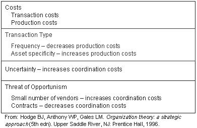 Transaction cost theory studies the governance mechanisms that can be used to achieve economic efficiency and proposes that the optimum organisational structure is that which minimises transaction costs or the costs of exchange9. The theory proposes that each exchange produces coordination costs of monitoring, controlling and managing the transaction. Williamson argues that such costs are to be distinguished from production costs, and a decision-maker can make a choice to use a firm structure, thereby producing the good or service internally, or the market place, by comparing transaction and production costs9. Researchers suggest that the firm is the optimal structure when it can accomplish exchanges at a cost lower than any other form 8,10,11.