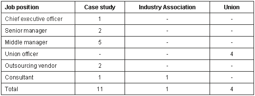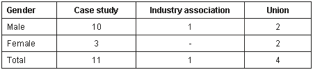 The documentation was gathered to analyse the situational context of the health organisation's operation when the outsourcing decision was made. Annual reports, consultants' reports, and internal documentation provided this information. Consultants' reports were confidential and were provided at the option of the managers. Restrictions were also put on supplementary internal documentation and, therefore, supplied only at the prerogative of the managers. Triangulation was gained through having interviewees from multiple parts of the case study entity and private sector vendor, as well as external consultants, industry association members and union officials. Participant demographics showing both the gender and job position of those interviewed are outlined in the following tables.