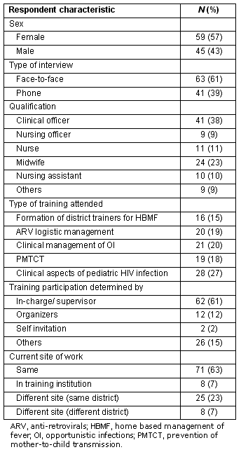 The limitations of this study include the methodology. Because the sampling was purposive the findings may not generalise to the whole population of health workers in training. A substantial proportion of the respondents were interviewed by telephone, rather than face-to-face. While no sensitive questions were asked, the differences in interview settings may have affected some responses. Additionally, some health workers could not be found or contacted. The time elapsed since training could have introduced recall bias to questionnaire responses; some participants said they could not remember very well or declined to answer to some questions. Finally, although this study attempted to assess whether skills were being used by trainees, it did not examine how they were being utilized which would have required direct observation of health workers' practices. Without the critical component of direct observation, it is difficult to evaluate long-term training effectiveness and usefulness.