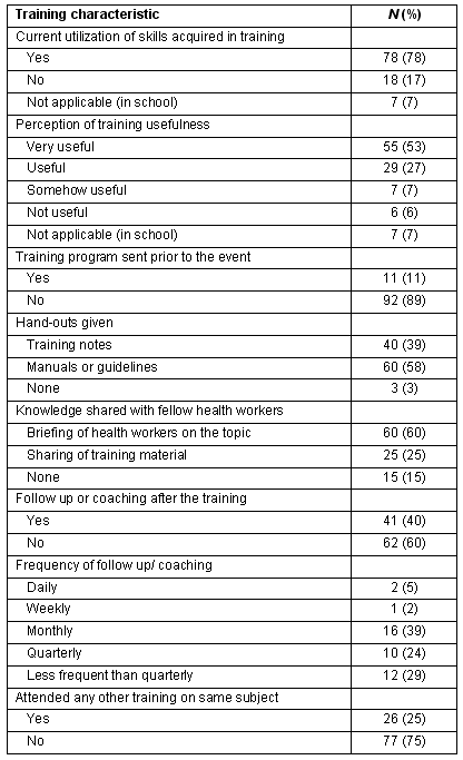 Few of the participants (11%) had received a detailed program prior to the training attended; however, 100 (97%) were provided hand-outs in the form of training notes, participants' manual or implementation guidelines. It is notable that 15 of the 100 did not share the hand-outs with colleagues, mainly due to busy working schedules and a lack of time.