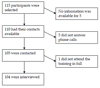 In total, 115 health workers from 9 districts who participated in 5 training events were identified. It was possible to establish current work place and measure retention rate for 112. However, only 104 participants (92%) were interviewed (Fig1).
