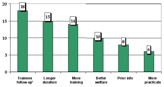 When asked for suggestions to improve the organization of courses of similar content (Fig3), 25% of the 99 respondents who provided an answer said that follow-up of trainees in their respective work places would be very useful; 22% mentioned conducting longer courses; 21% wanted more training and more people trained; 15% suggested improvement in the participants' 'welfare', suggesting that out-of-pocket allowances were unfairly paid to trainees at different rates.