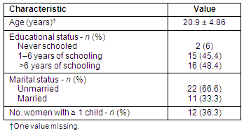 The socio-demographic characteristics of the sample are presented (Table 1). Thirty-three young women participated in the study and ranged in age from 15 to 29 years. Participants had an average education level of grade 6. Four young women were enrolled in grade 6 or above during the study period. One-third of the participants (n = 11) were married and nine of these young women had one or more child. Three of the single young women had a child. Five of the 11 married young women had a village of origin outside the study site; two were from neighboring villages, two from a village within 1 hour's walk and one from another province, accessible only by air or sea. This diversity offered interesting insights and nuances into the ways young women's health needs were framed and prioritized in the context of their marital status and associated roles and responsibilities.