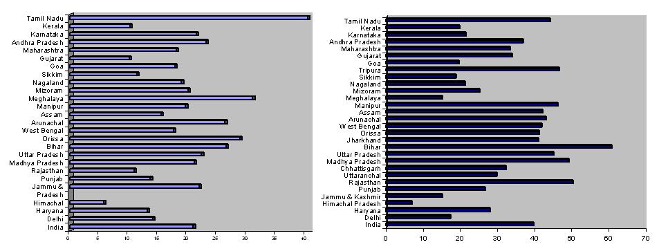 An unhealthy mother gives birth to an unhealthy child. According to the NFHS, Indian children have among the highest incidence of malnourishment in the world (Table 5). More than half (53%) of all girls and boys under 4 years were malnourished, and a similar proportion (52%) was stunted (too short for their age). Other studies show that many women never achieve full physical development4. This incomplete physical development poses the considerable risk for women of obstructed obstetric deliveries.