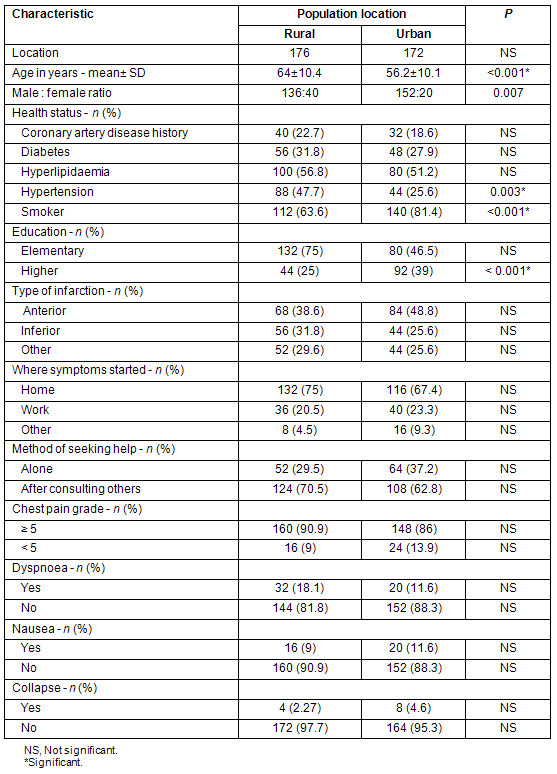 The rural and urban populations differed in certain ways: the rural participants were older, of lower educational and economic levels, and they had limited access to health-related information. Some of these characteristics have been associated with a greater delay in seeking treatment. Primary care in Greece's rural areas is provided mainly through local health centres; however, the management of emergency cases is only available at the two hospitals in Heraklion city. Therefore, the identification and quantification of pre-hospital time delays could have implications for the way the Greek National Health System is organized, particularly regarding emergency care in rural areas. Identifying factors that correlate with delay, regardless of residence (patient-related delay), can also provide clues to assist in shortening delays.