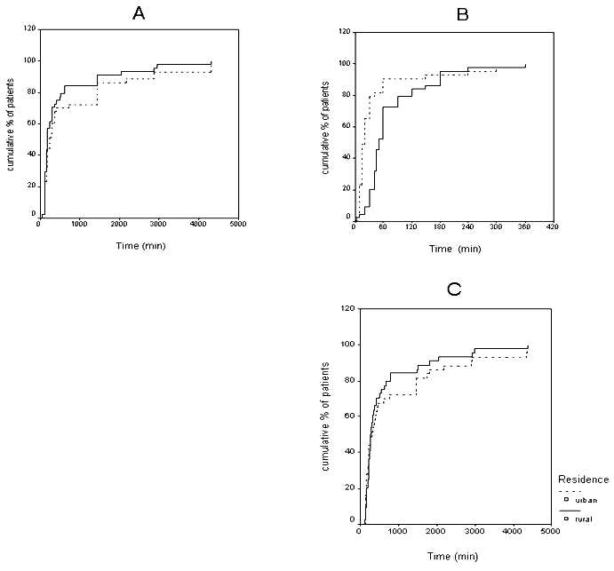 Figure 1: Kaplan-Meier curves showing: (A) patient-related delay; (B) pre-hospital delay; and (C) total delay for patients living in urban and rural areas.