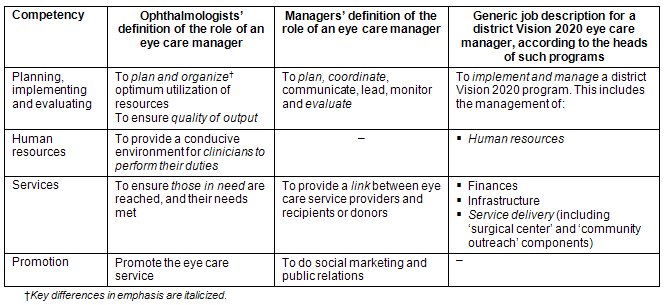 There was considerable overlap and agreement between the perceptions of ophthalmologists and eye care program managers as to the role and tasks of the managers. However, there was difference in emphasis. The heads of eye care programs (non-government organization representatives and national blindness prevention coordinators) focused on the knowledge and understanding that an eye care manager should possess (Tables 1,2). The key differences in emphasis are indicated in the tables in italicized font.