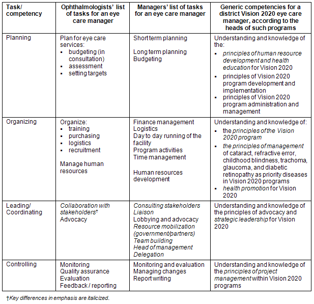 Table 2: Definitions of tasks/ 'generic competencies' of a Sub-Saharan eye care manager