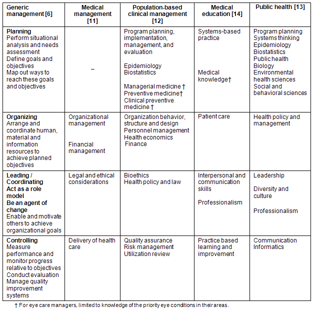 The core expectations of what is required of eye care managers (Tables 1,2) were in keeping with what are regarded as generic management competencies and skills (Table 3)6. However, there was an expectation (Tables 1,2) of a wide range of additional competencies (eg population/public health, including eye health promotion; clinical/medical eye care) because these would be necessary in the provision of comprehensive eye care services. These were commensurate with the competencies specified for medical and population-based clinical management, medical education and public health (Table 3)6. Research focused, and more analytical skills such as epidemiology and biostatistics were considered less relevant to the tasks of an eye care manager and were therefore excluded. Public health biology and environmental health sciences were also excluded.