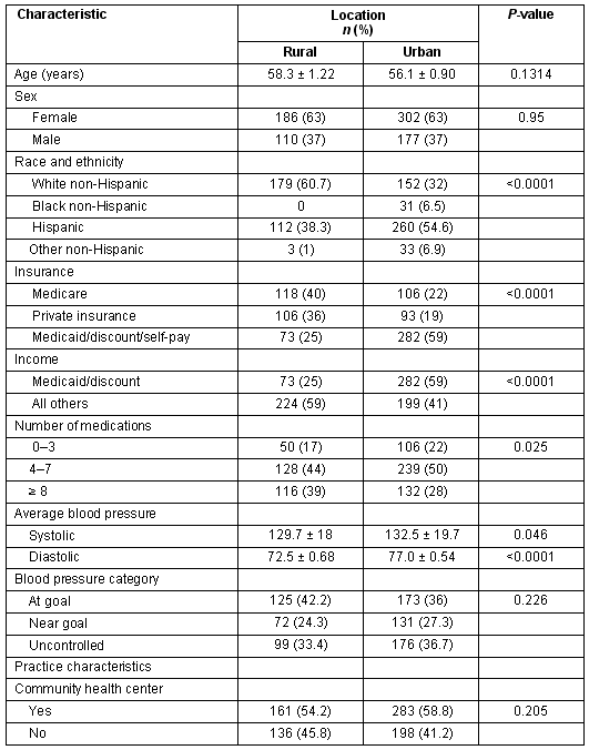 Twenty-six primary care practices participated with 13 sites in rural settings and 13 in urban settings. The rural clinics completed 297 surveys and urban sites completed 481. The patients were primarily females who sought care at a CHC, with rural and urban patients being approximately the same age (56.1 and 58.3 years, respectively). Rural patients were more likely to be white non-Hispanic, with Medicare, taking 8 or more prescription medications and less likely to be on Medicaid, which is, as above, a government sponsored insurance for very low income residents with significant disabilities (p<0.01). Results also indicated that rural patients on average had lower diastolic BP (p<0.001) and slightly lower systolic BP compared with patients with diabetes from urban practices (p = 0.046) (Table 1; Fig1).