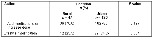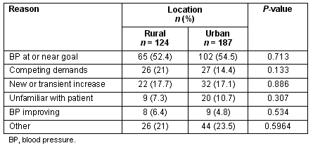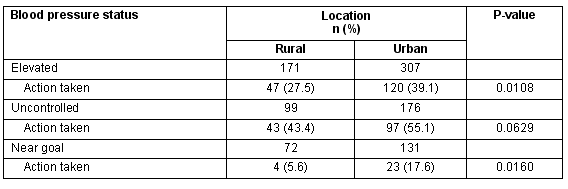 The type of action and reasons for inaction for those patients with elevated BP were also not significantly different according to practice location (Tables 4, 5).