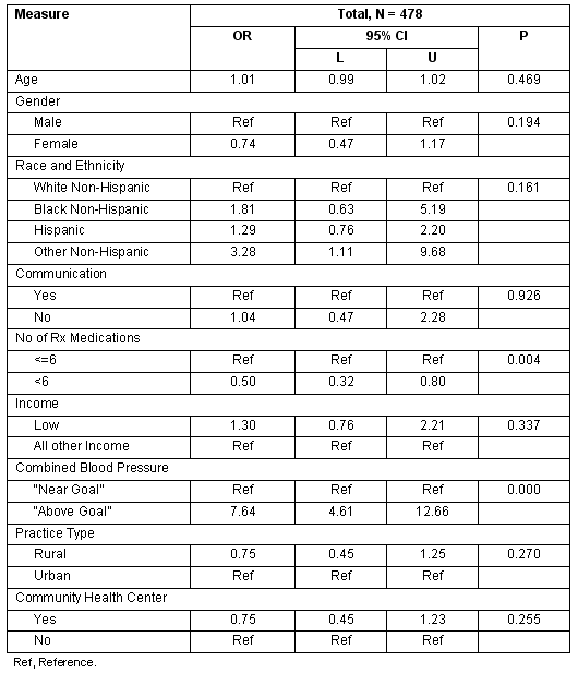 Multivariate Analysis: Using patients with elevated BP, multivariate logistic regression analyses determined adjusted associations on action taken to control patients' BP during the visit (yes/no) and practice setting (rural vs urban). Initially multivariate models that accounted for clustering of patients within practices were explored. However, because the interclass correlation coefficient (ICC) of the clustering was low (ICC = 0.03; p = 0.2015), classic multivariate logistic regression analyses were used. The model adjusted for general demographic measures (age, sex, race and ethnicity), BP ('near goal' or 'uncontrolled'), practice level measures (practice setting, CHC) and covariates that were significantly associated at the alpha level of 0.20 with the outcome, 'action taken', from the bivariate analysis (communication problems, income level, number of prescription medications). All analyses were performed using SAS v 9.1(SAS Institute Inc; Cary, NC, USA).
