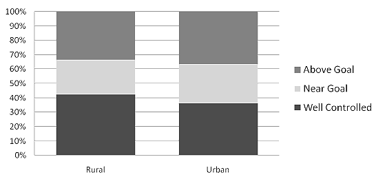 When comparing rural and urban clinicians, there was no evidence of a difference in the quality of care in the management of elevated BP among their patients with diabetes. This was also so for CHCs. However, elevated BP is common in both settings and diligence is required among providers, regardless of urban or rural setting, in lowering BP among patients with diabetes.