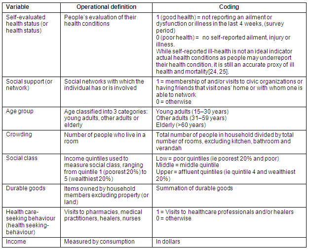 The multivariate model used in the present study is a modification of those of Grossman21, Smith & Kington22 and Bourne5,23, which captures the multi-dimensional concept of health and health status. The current study added some new factors, such as crowding and consumption per person in the household. Another fundamental difference between this and the former models is that the present study is area-specific and focused primarily on rural residence, which includes the majority of the poor in Jamaica. For effective health education and private care to take place, this cohort's health status must be understood.