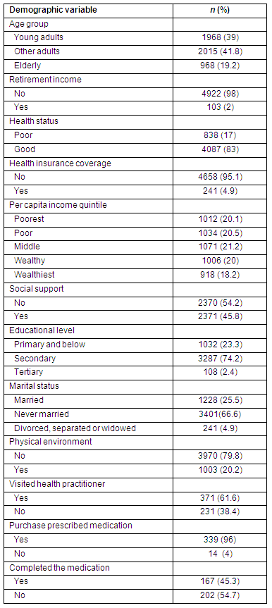 Of the sampled respondents 39% were young adults (15-30 years), 41.8% adults (31-59 years) and 19.2% elderly (≥60 years). In all, 83% reported good health. Only 61.6% (n = 371) of those who indicated poor health had visited a health practitioner in the last 4 weeks. Of those with self-reported health conditions, 96% claimed they had purchased medication, with only 45.3% mentioning that they completed taking the prescribed medication. Of those who responded to the health insurance question, 4.9% (n = 241) had private coverage (Table 3).