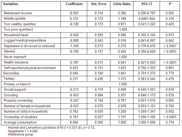 Of the 12 identified variables tested in this study, 6 were found to be statistically significant (p<0.05) for the final model (Table 4). These 6 social determinants are: retirement income, marital status, health insurance, number of children in the household, asset ownership (durable goods), and sex of respondents. The model provided a good fit to the data, based on the Hosmer and Lemeshow test.