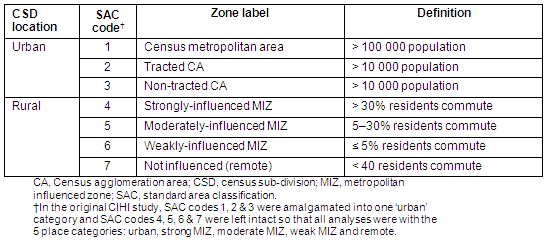 Next, each CSD was categorized into one of 7 possible MIZs (Table 1)12. These MIZs characterize rural areas according to population size and proximity and influence exerted by nearby urban areas. The MIZs offer a more sophisticated way of defining 'rural' than is found in typical analyses where rural areas are defined solely in terms of population size or density. Statistics Canada's MIZ system estimates the level of influence exerted by nearby urban areas by assessing the proportion of residents in a rural CSD who commute on a regular basis to nearby urban areas. While this is a fairly crude measure of urban 'influence' on a rural CSD, it is a vast improvement when compared with traditional 'size-only' measures of rurality.