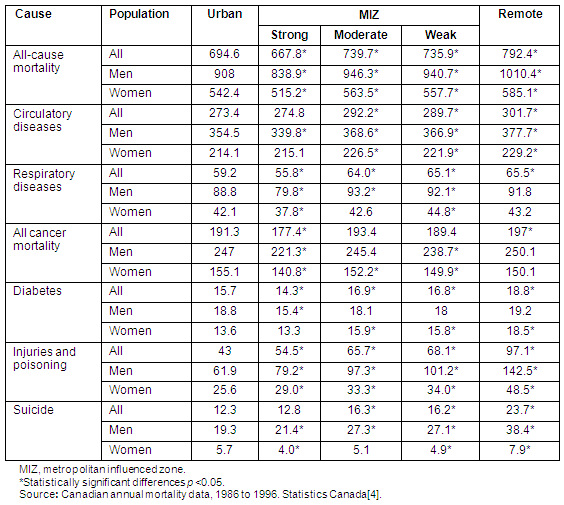 The results section of the original CIHI report and the appendix contained a number of tables with data on mortality rates for major causes of death by MIZ regions, age group, and gender. The original report presented general results with discussion based on each major causes of death. Results were tabulated for each cause of death by gender and age groups (usually years 0-4, 5-19, 20-44, 45-64 and ≥65).