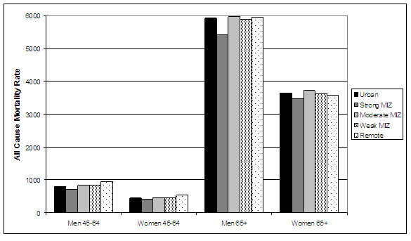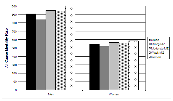 Figure 1 illustrates the presence of a rough gradient in all-cause mortality for both genders moving from strong MIZs through to remote regions. All-cause mortality rates for both men and women are approximately 20% greater in remote compared with strong MIZ regions.