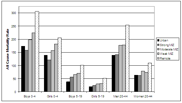 Five main conclusions are drawn from this research. First, mortality tend to be worse moving from urban to remote regions, except in the case of strong MIZs where rates tend to be lower than they are in urban places and in other rural MIZs. Second, these differences in mortality along the urban-rural continuum are mainly driven by those under age 45 and particularly deaths caused by injury and poisoning, MVA and suicide. Third, the proportion of excess deaths relative to urban places for those under age 45 increases with decreasing age. Fourth, remote places have the highest excess in mortality for suicide, MVA, injury and poisoning, relative to urban places.