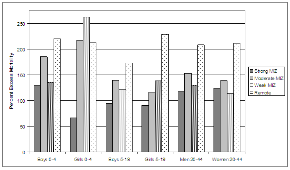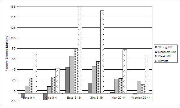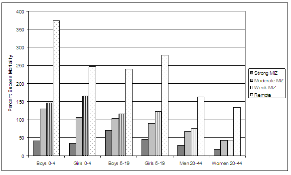 Mortality from MVAs are higher in all rural compared with urban places. Unlike suicide and injury/poisoning mortality, for MVAs there is relatively little difference in the observed patterns of excess rural mortality among age groups. Excess MVA mortality in remote places is in the 175-225% range for all age groups. In weak MIZs, excess MVA mortality for girls age 0-4 is 275%, compared with being in the 125% range for boys and girls and men and women in other age groups (Fig7).
