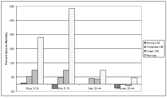 Excess suicide mortality for girls and boys age 5-19 living in remote places is, respectively, 533% and 329% greater than for girls and boys of the same age residing in urban places. In weak MIZs excess suicide mortality for 5-19 year-olds is similar for girls and boys and is 'only' 50% greater than those of the same age living in urban places (Fig5).