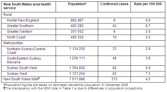 Table 2: Confirmed H1N109 infection rates in the eight New South Wales area health services at the end of the Contain Phase, 17 June 2009