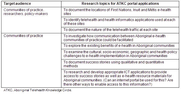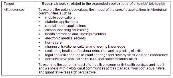 Research that goes beyond the videoconferencing application is seen as a key requirement for an Aboriginal telehealth research agenda. A broader look at e-health and various telehealth applications is necessary to expand the use of ICT to address the unique health disparities in Aboriginal communities at a national level. The health sector must learn more about applications that are less known but have the capacity to support the health goals of Aboriginal communities, as listed (Table 6).