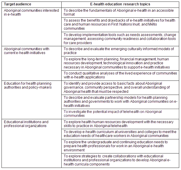 Stakeholders identified a broad range of educational materials that are urgently required to promote the benefits of e-health in Aboriginal communities to government employees, policy-makers, Aboriginal community leaders, health professionals and educators. An overview of the research and development priorities in the area of education and professional development is provided (Table 3).