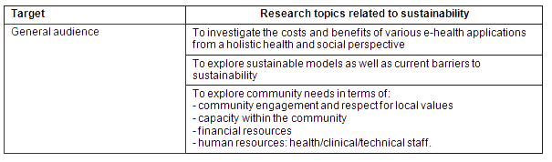 Participants expressed that sustainability is an important issue for Aboriginal e-health initiatives. There is significant interest by community leaders and policy-makers to learn more about how, for example, telehealth programs can be sustained and expanded over time. The associated research priorities are listed (Table 4).