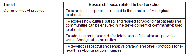 E-health and telehealth is evolving within mainstream clinical or hospital environments, and the existing models and standards for practice are tailored to these environments. Consequently, there is a need for community-based Aboriginal models of practice and culturally competent models of care that respect the cultural background of Aboriginal patients. Cultural considerations must be a priority to ensure successful integration of telehealth applications at the community level. Best-practice research is required.