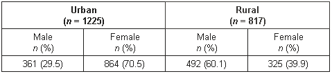 A total of 2042 subjects were studied in and around Faisalabad city. There were 853 males (41.8%) and 1189 females (58.2%). The number of urban subjects was 1225 (60%) and rural 817 (40%). The distribution of male and female children between urban and rural locations is shown (Table 1).